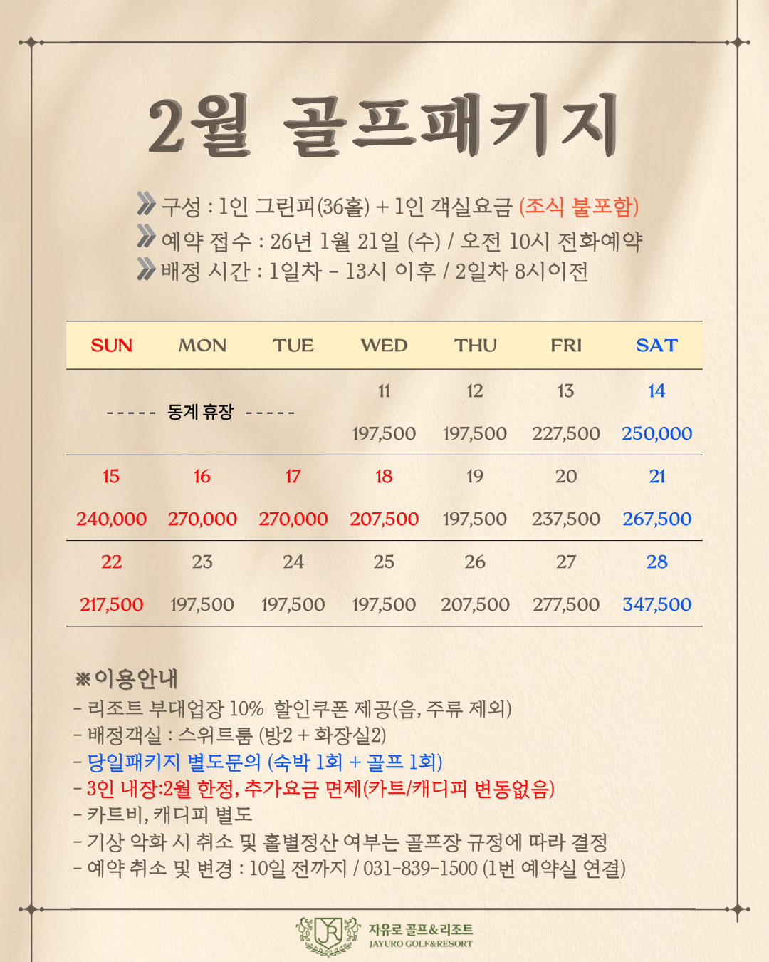 제목 : 26년 2월 골프패키지 및 리조트 부대시설 이용안내