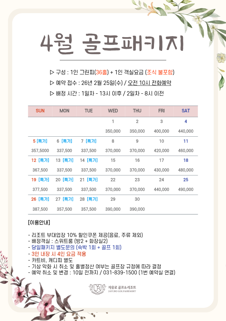 제목 : 26년 4월 골프패키지 및 리조트 부대시설 이용안내